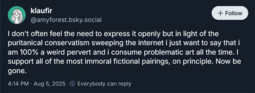 >>17333I am very curious on how much Klaufir has gotten accomplished if the next version is indeed in development, and unfortunately until it arrives (or Klaufir decides to leak details) we'll be in the dark. On a less-related note, I appreciate him voicing his disdain for the puritan annoyballs that run rampant these days, and the nude Fluorette spritesheet has only made me like him even more. We need more YNFG personalities who are willing to get freaky, I say.